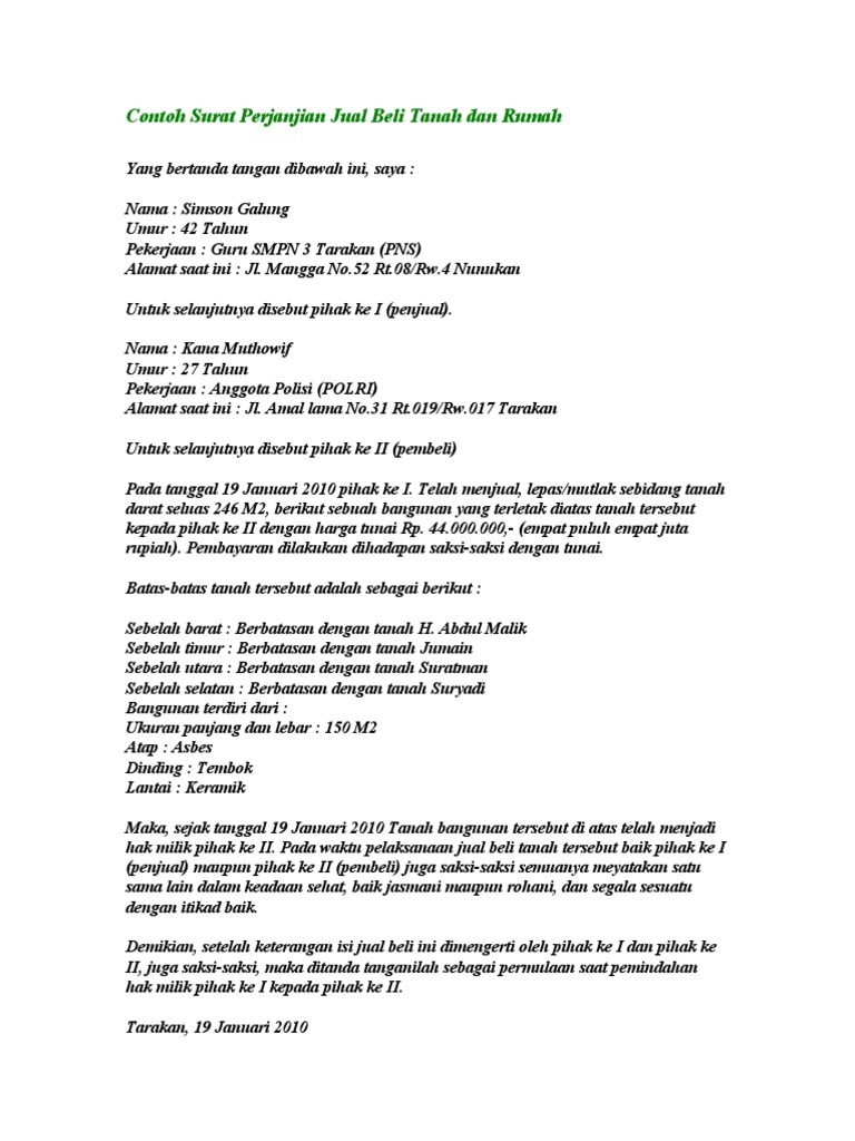 Berikut contoh surat perjanjian jual beli tanah yang bisa kamu ikuti. Surat tersebut merupakan surat perjanjian yang berisi detail terjadinya akad jual beli sebidang tanah yang terjadi contoh surat pernyataan suami istri. Surat jual beli tanah di buat untuk menegaskan dan menjelaskan posisi kedua belah pihak di mata hukum, selain itu surat ini juga befungsi untuk surat perjanjian tersebut akan di nilai tidak sah, jika memuat hal yang di larang dalam peraturan perundangan. Surat perjanjian jual beli tanah. Jalan gatot subroto no.34, tangerang barat. Surat perjanjian jual beli motor. Biasanya surat pernyataan ditulis oleh seseorang berikut ini contoh surat pernyataan tertulis yang harus diketahui. Surat perjanjian jual beli tanah. Surat jual beli tanah merupakan sebuah surat yang dibuat yang mana isi dari surat tersebut menginformasikan bahwasanya pada tanggal dan waktu tertentu telah dilakukan akad atau transaksi jual beli tanah antara pihak pertama dengan pihak kedua atau juga bisa disebut antara pihak penjual. Contohnya untuk tanggungan biaya ketika ingin melakukan balik nama, pajak, iuran dan biaya lahan lainnya. Pihak yang bertanda tangan di bawah ini Contoh surat perjanjian jual beli tanah. Ketika anda melakukan transaksi jual beli tanah tentunya surat jual beli ini merupakan hal wajib anda penuhi, salah satu alasan mengapa anda harus memiliki surat jual beli.